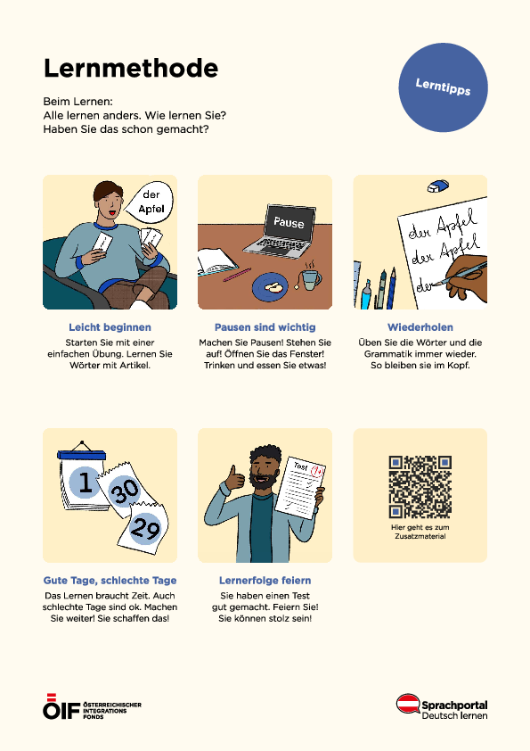 Die Kursteilnehmer/innen haben viele verschiedene Lernmethoden kennengelernt. Gestalten Sie nun gemeinsam ein Plakat an der Tafel, auf dem alle im Unterricht besprochenen Lerntipps und Lernmethoden gesammelt werden. Anschließend markieren die Kursteilnehmer/innen dann ihre Favoriten mit Stiften, Punkten oder Stickern.